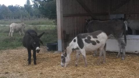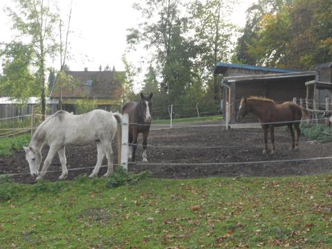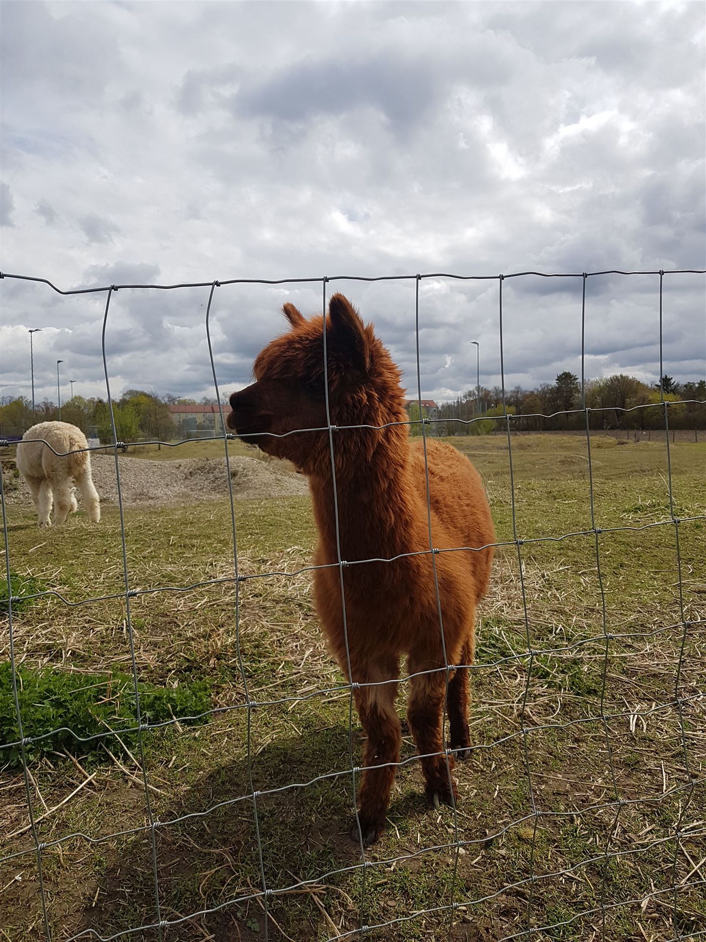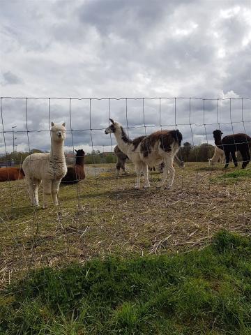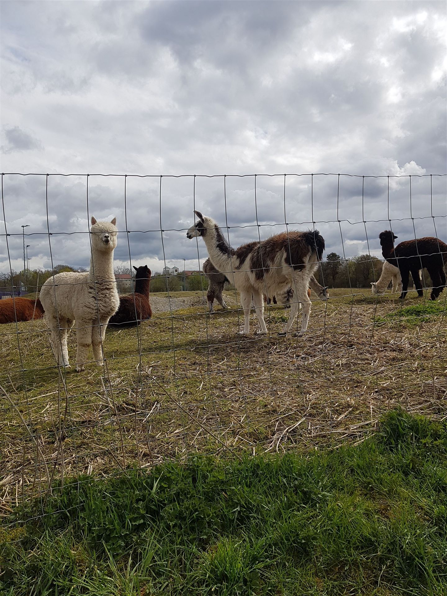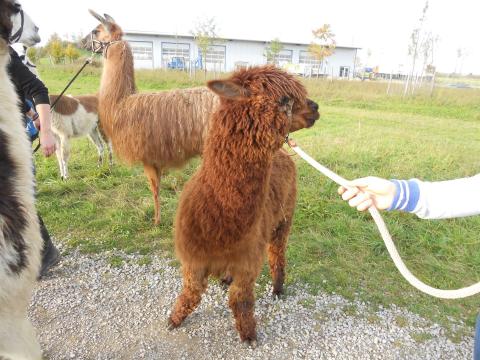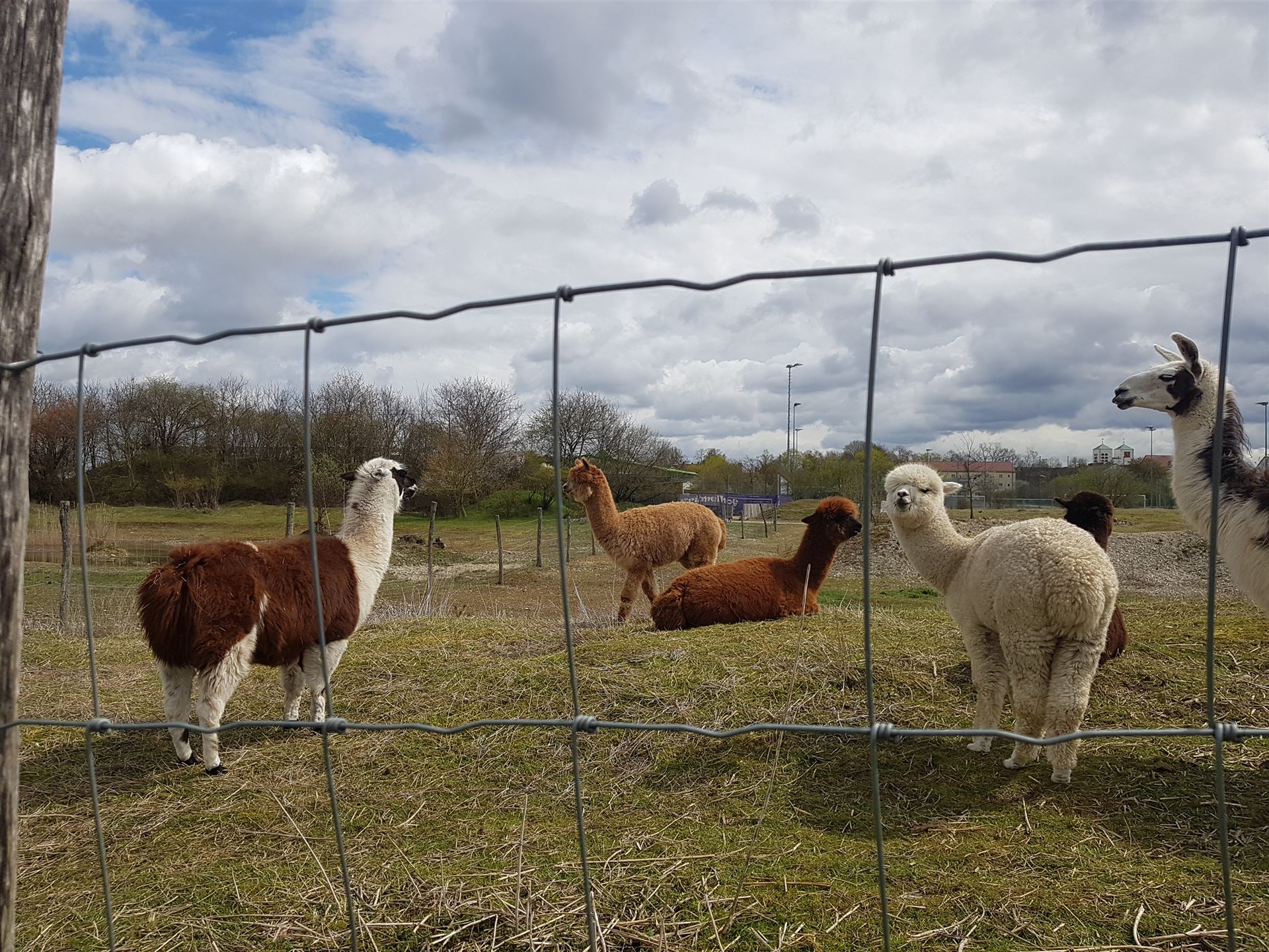 auf der linken Seite vorbei an einem Gehege für Ponys, rechts sehen wir Lamas und Alpakas.