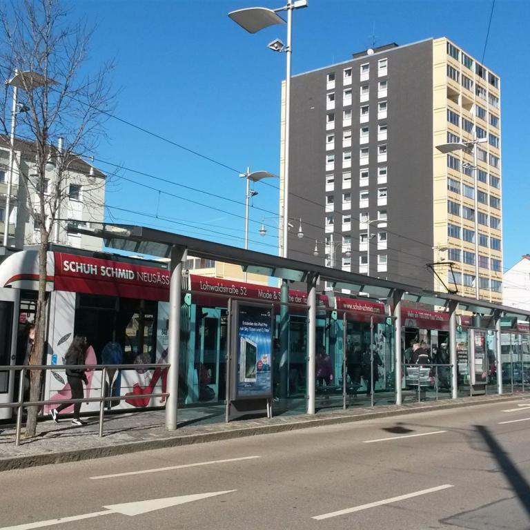 Doch weiter geht es auf der Donauwörther Straße. Vorbei an neu gebauten Wohnblöcken bis zur Haltestelle Bärenwirt. Dies ist ein Umsteigeplatz in Busse und Straßenbahn, in alle Richtungen.