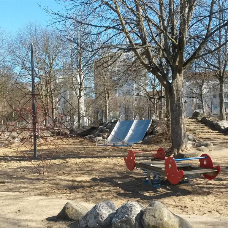 Der Kindertagestätte, hinter der sich ein großer Spiel- und Bolzplatz mit Grünanlage befindet.